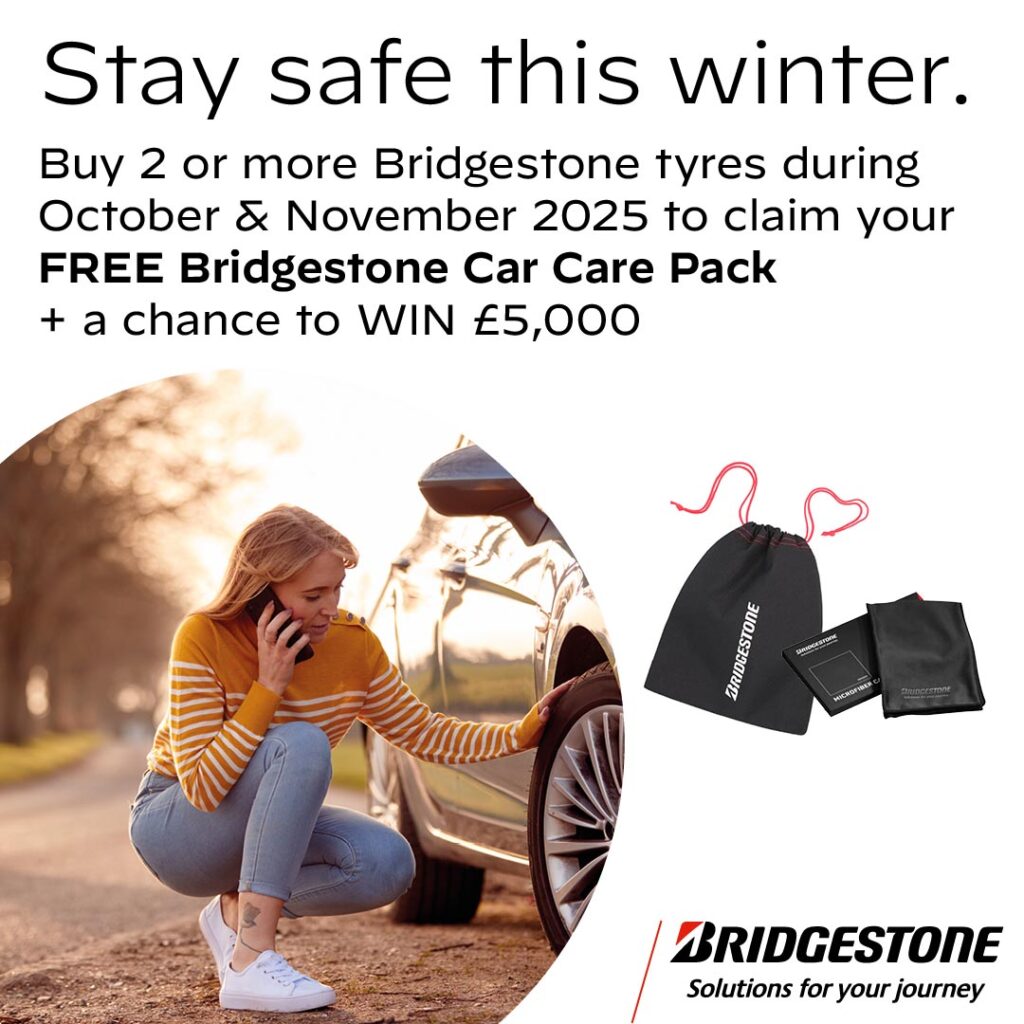 When you buy 2 or more Bridgestone Car, Van or 4×4 tyres in store or online, you’ll receive a FREE Bridgestone Car Care Pack to keep your vehicle winter ready.